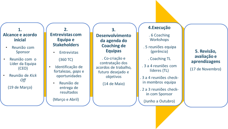 O processo de Coaching tipicamente inicia com o Coaching da equipa de liderança e uma revisão conjunta de propósito, visão e estratégia através das lentes dos diferentes stakeholders e sistemas. Um diagnóstico sistémico prévio identifica fortalezas, áreas críticas e oportunidades.